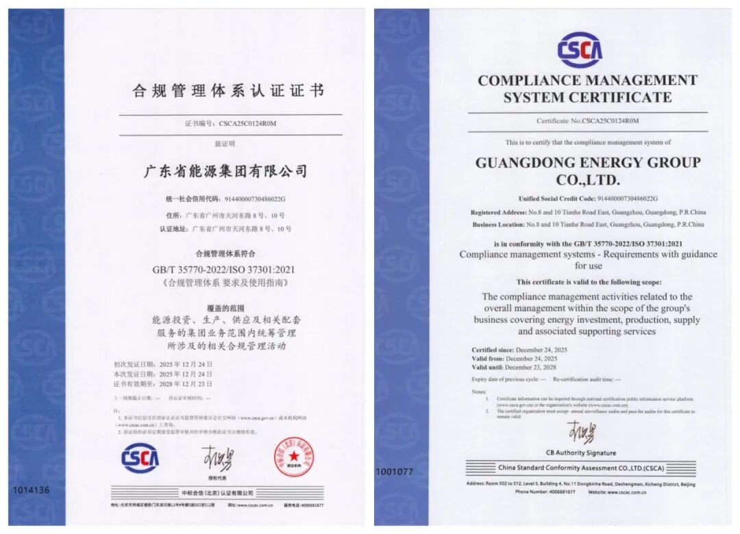近日,集团顺利通过第三方认证机构严格审核,再次获颁GB/T 35770-2022及ISO 37301:2021合规管理体系认证证书,标志着集团继2022年成为国内大型电力企业集团及广东省属企业中首家获得该认证的企业、于认证证书第一个3年周期届满后,再次通过双认证审核,正式进入第二个认证周期。