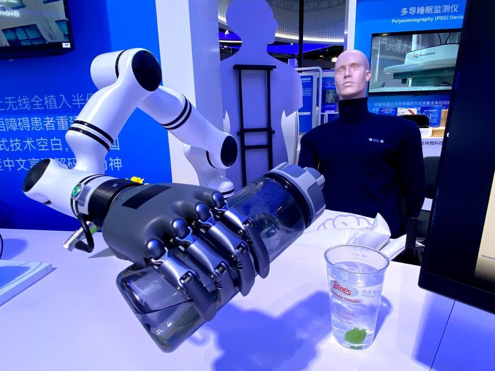 3月27日在2026中关村论坛年会展览上拍摄的“北脑一号”智能脑机系统启动机械臂往杯里倒水。