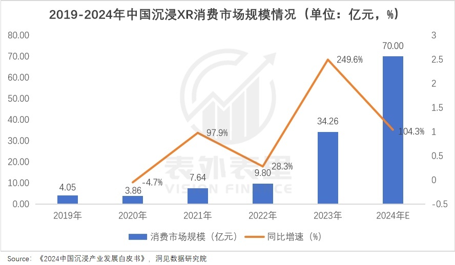 “整个行业热火朝天。”他亲眼见到VR体验馆,从平均每座城市两三家,进化到每个商圈两三家。数据也显示,国内沉浸XR消费市场规模在2023-2024年翻倍增长,达到70亿小高峰。